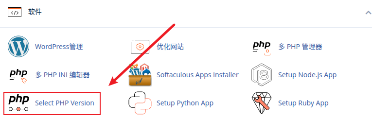 登录cPanel面板后往下拉找到“软件”,点击“Select PHP Version”:
