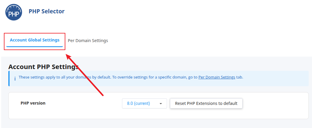 如下图所示,在PHP版本切换页面点击Account Global Settings: