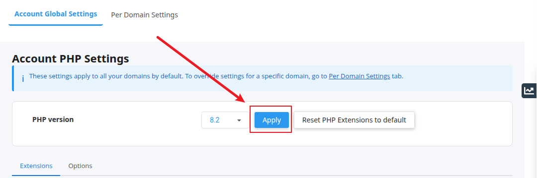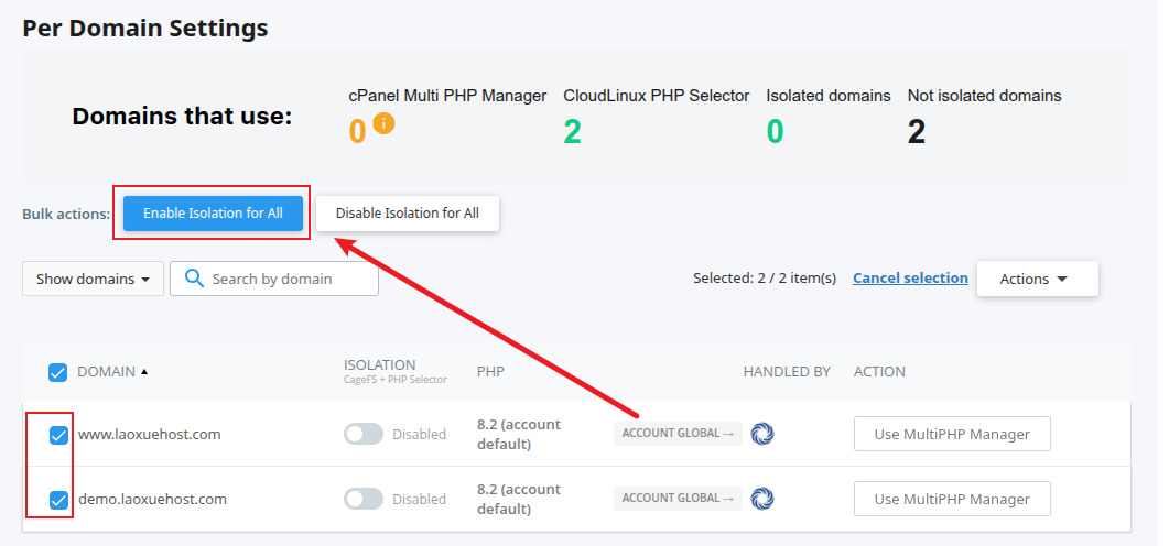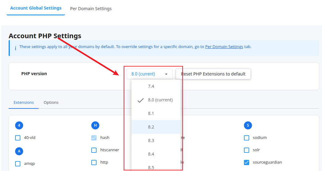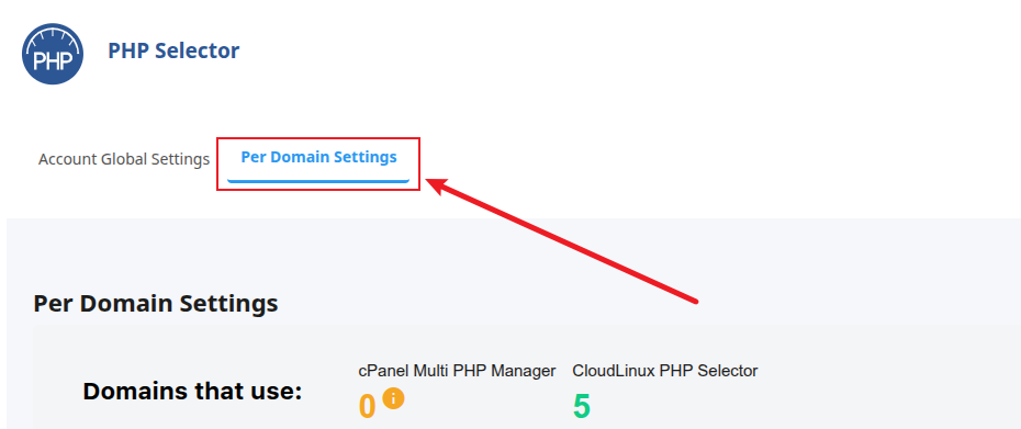 如下图所示,在PHP版本切换页面点击Per Domain Settings: