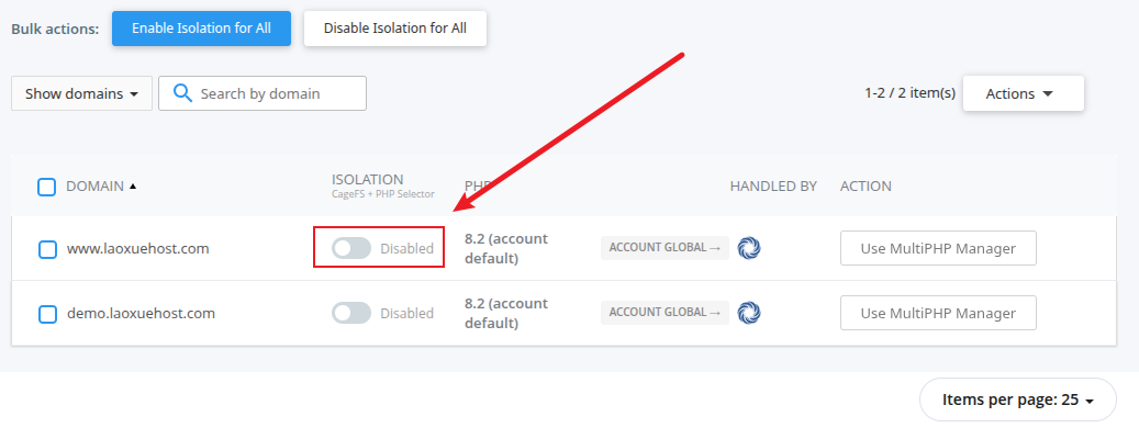 勾选需要设置的域名,点击Enable Isolation for All开启环境隔离功能: