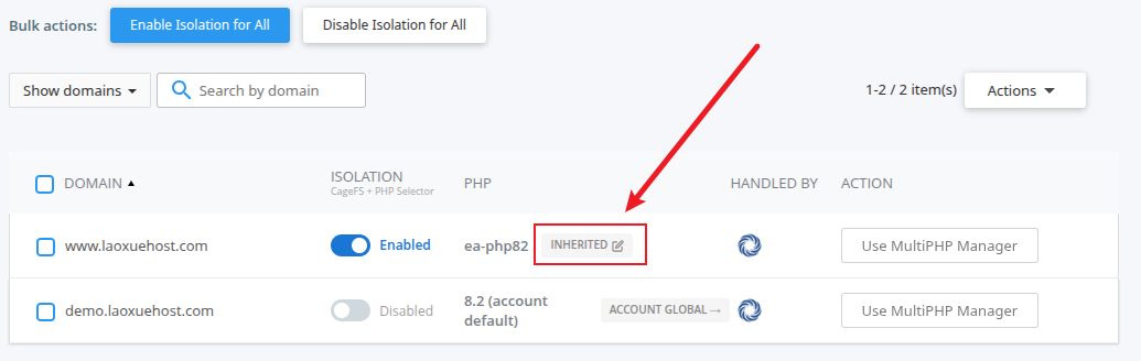 开启隔离功能的域名一栏会显示修改PHP版本按钮: