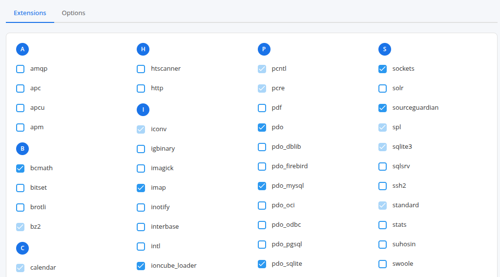 有些程序需要特殊的PHP扩展支持,可以在切换PHP版本的界面选择需要的扩展: