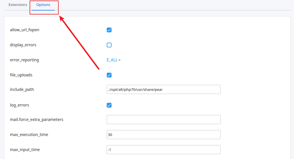 如下图所示,在PHP版本切换页面选择options即可设置php.ini参数: