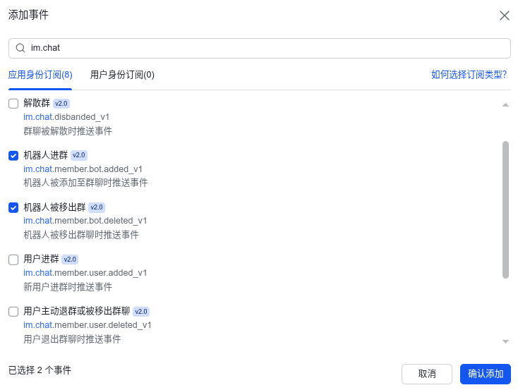 继续添加事件,输入:im.chat,勾选机器人进群和机器人被移出群: