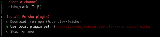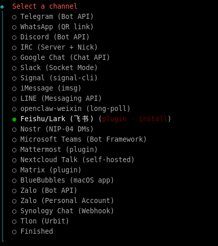 执行以下命令进入OpenClaw飞书配置流程: