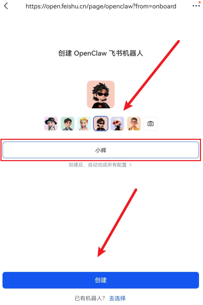 设置机器人头像和名称,然后点击创建: